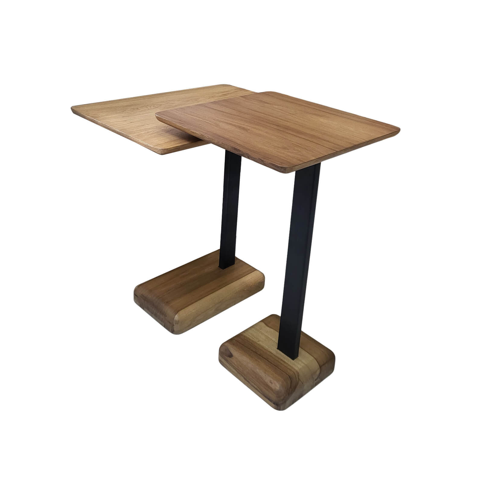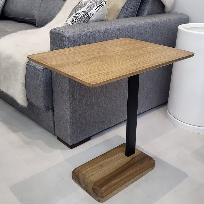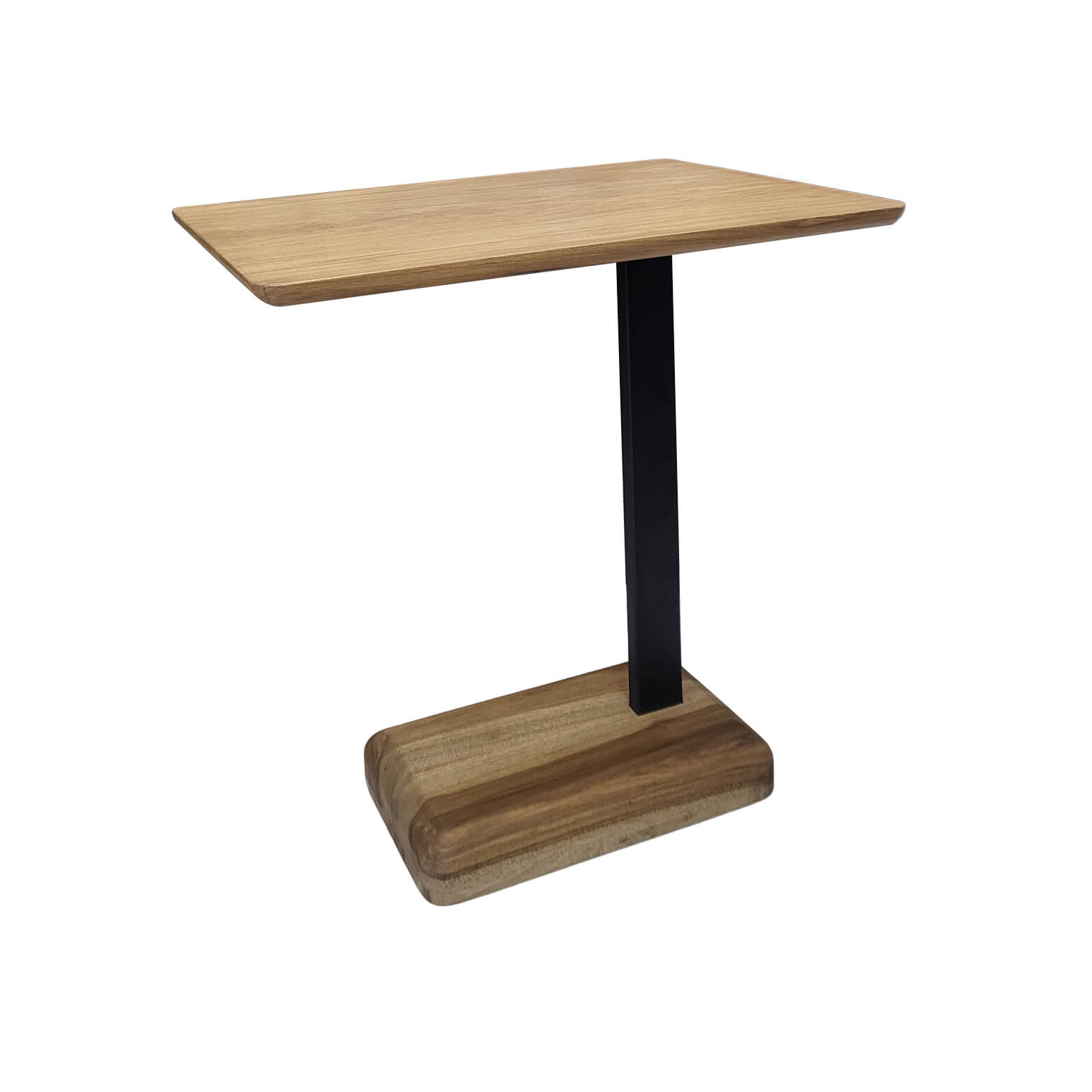Mesa lateral con tapa y base en madera de Petiribí lustre al poliuretano terminación semi mate color natural con estructura metálica pintada al horno color negro.
