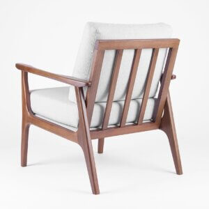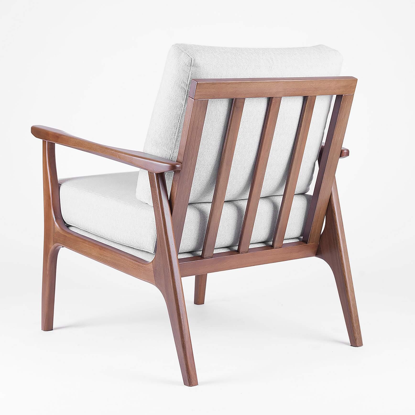 Sillón poltrona de estructura elaborada en madera de Eucaliptus con lustre al poliuretano color almendra. Asiento y respaldo tapizados en tela simil lino color gris plata.