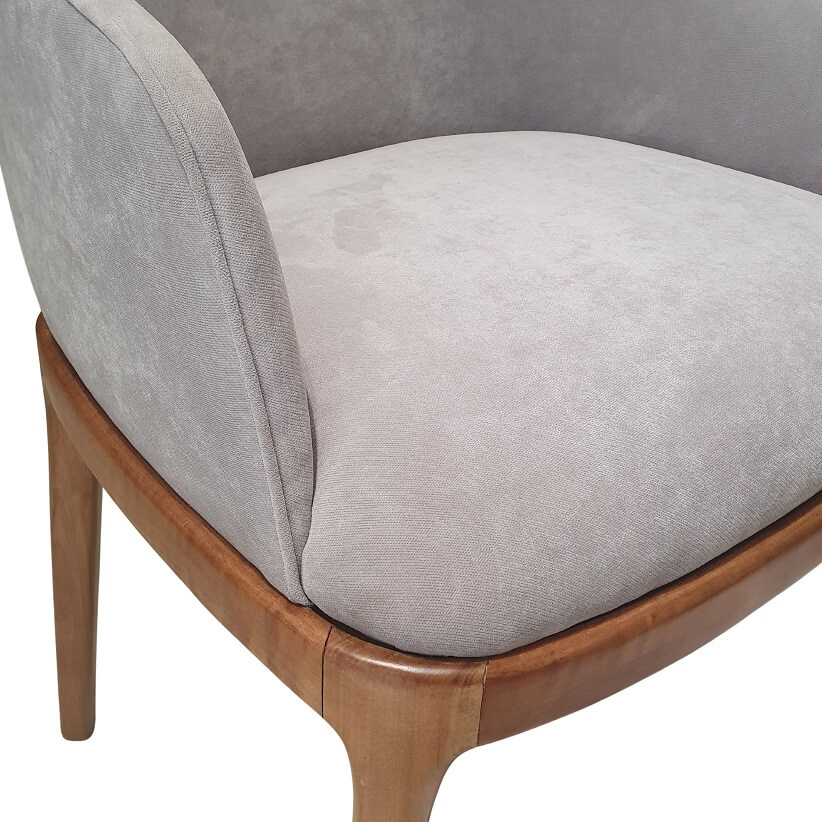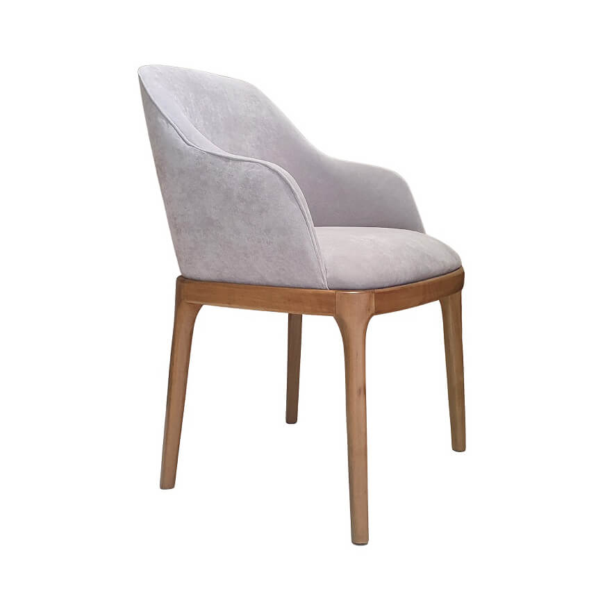 Silla con brazos de estructura fabricada en madera de Guindo lustrada al poliuretano en color almendra claro. Asiento, respaldo y apoya-brazos tapizados en tela Panne color perla con proceso anti-manchas.