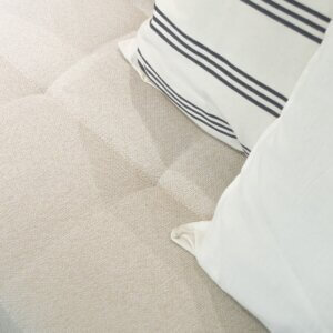 Sofá esquinero en dos módulos con patas de madera de Eucaliptus lustre almendra, tapizado en tela simil lino color grafito. Incluye 2 pouffs en su brazo lateral y conección USB. Disponible también en misma medida en color beige con patas lustre natural. Precio no incluye almohadones decorativos.
